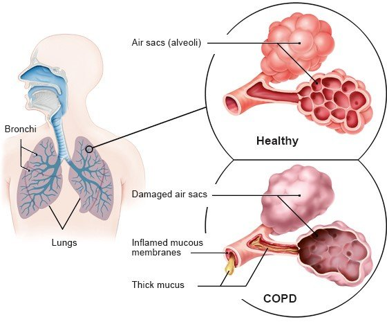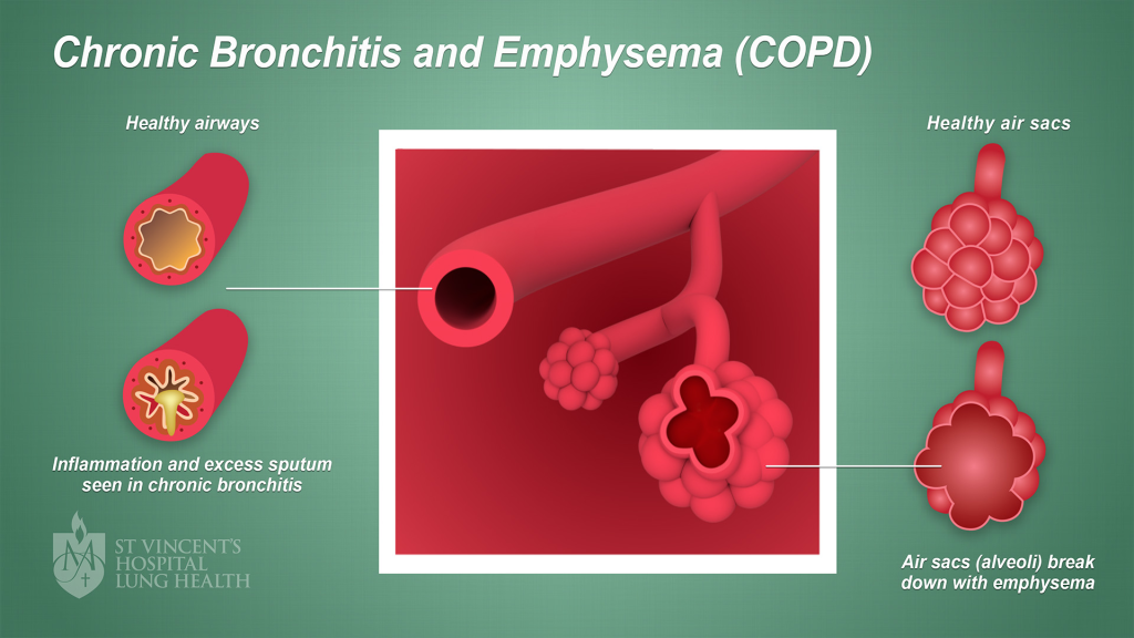2. Emphysema – when the air sacs which exchange gases at the end of your airways become damaged and enlarged, making it difficult to breathe.